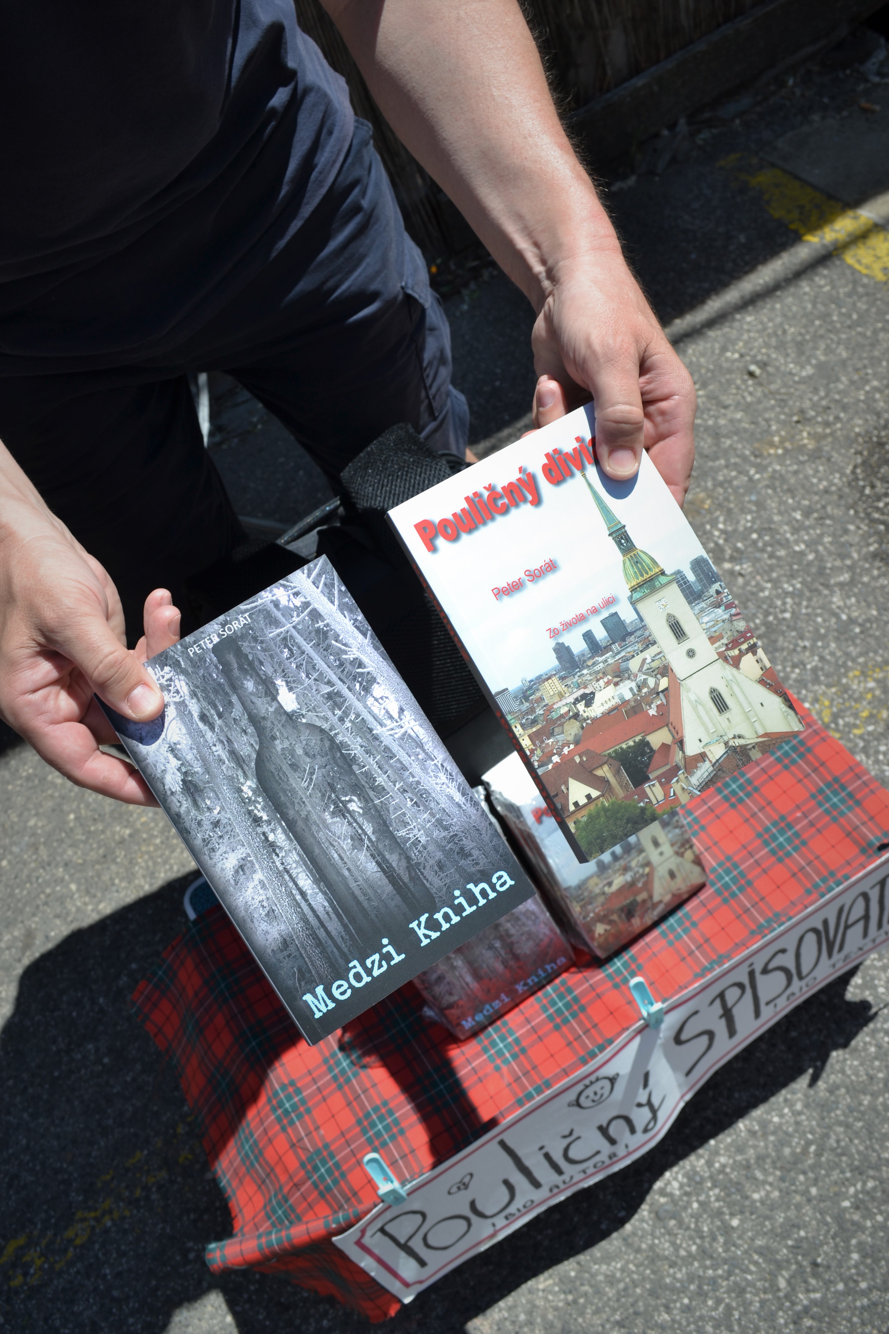Peter Sorát (48) je bratislavský pouličný spisovateľ. Vlastným nákladom vydal dve knihy. Nedajú sa kúpiť v kníhkupectvách. Predáva ich osobne na rozličných podujatiach alebo cez svoju FB stránku. Opisuje v nich svoje zážitky, ale aj príbehy mnohých ľudí, ktorých stretol na svojich potulkách životom. V 90. rokoch vyštudoval vysokú školu a cestoval po svete. Neskôr urobil množstvo chýb a skončil na ulici. Prežil na nej 9 rokov, podarilo sa mu z nej dostať a od roku 2012 býva v podnájme.